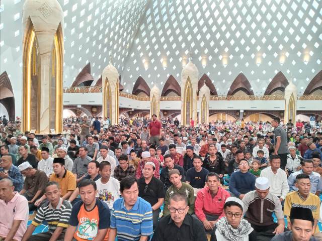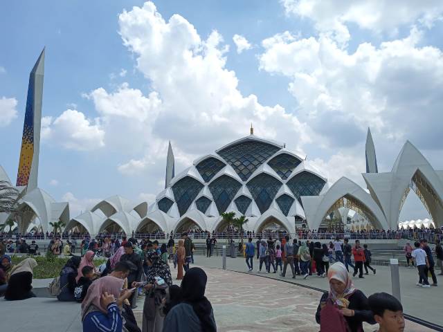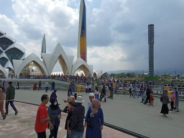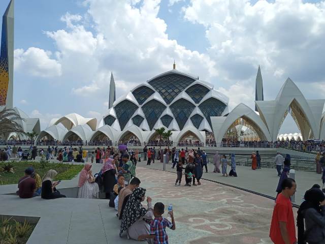 Suasana libur lebaran atau Idul Fitri 1444 H di Masjid Raya Al Jabbar, Senin (24/4/2023). Saat Shalat Dzuhur, ruang utama masjid dipadati jamaah untuk shalat berjamaah.