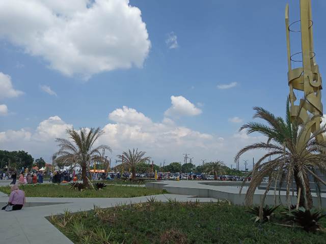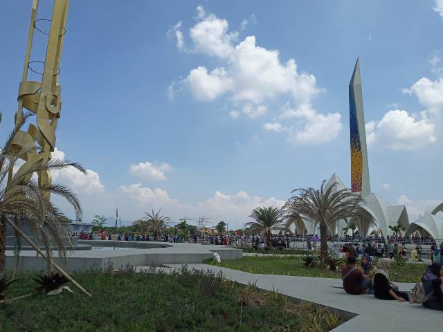 Di luar masjid, pengunjung memadati plaza dan selasar. Area parkir juga ramai, namun lebih tertib karena tidak ada pedagang (PKL).